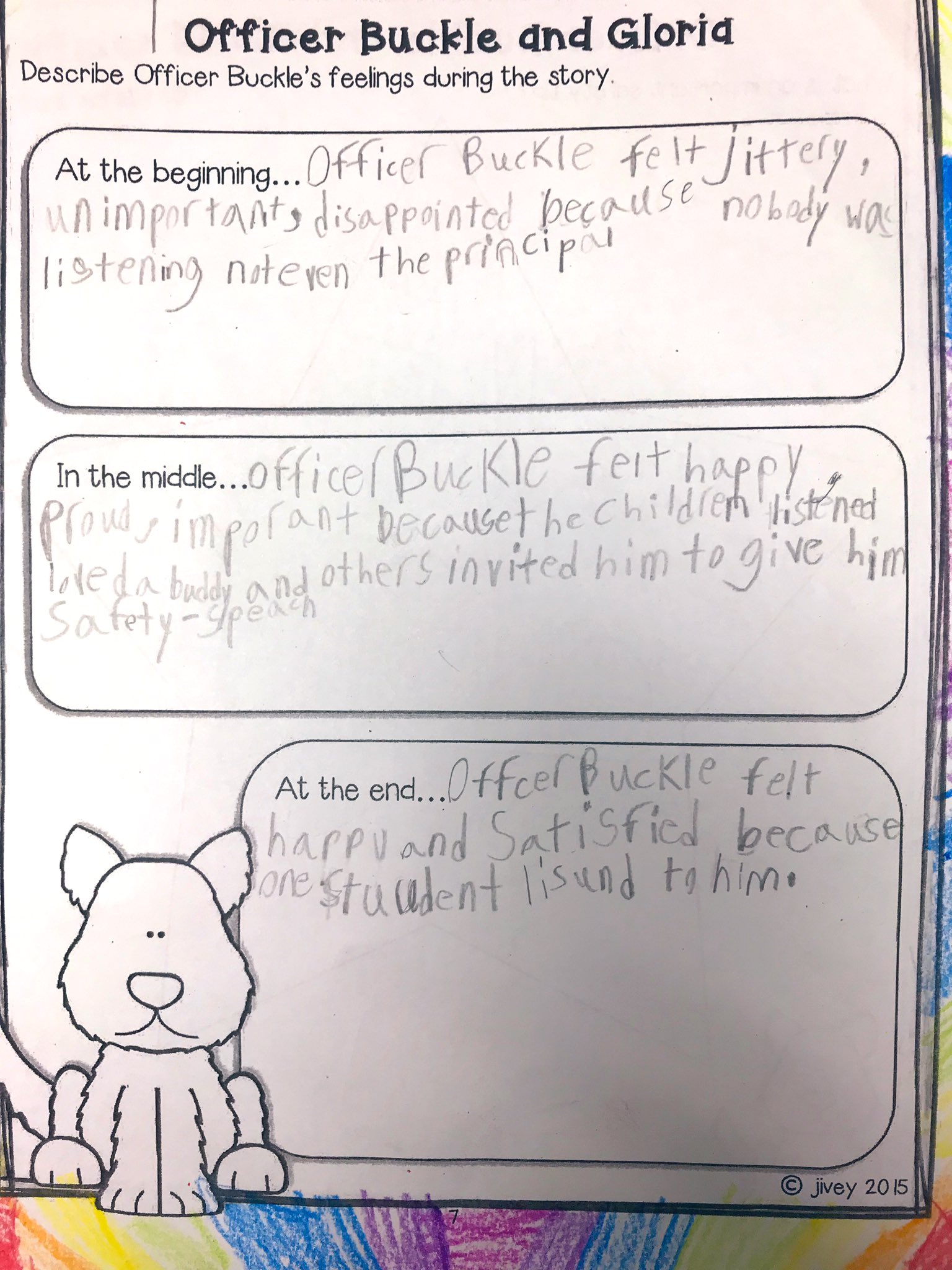 While the officer drones on Gloria acts out his tips to hilarious effect behind his back getting the children to laugh out loud. At first Officer Buckle doesnt like being upstaged by a dog but when an accident strikes the school he realizes how lucky he is to have Gloria working with him. Journeys grade 2SummaryOfficer Buckle is a local police officer who loves to think up new safety tips for the public to keep them safe.